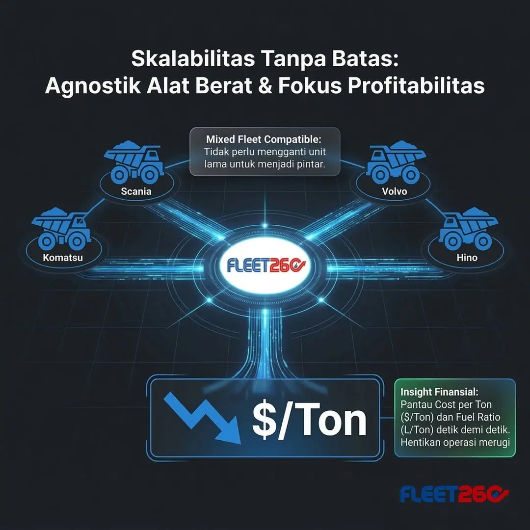FLEET260 menghadirkan Real-Time Profitability ($/Ton) agar setiap liter solar benar-benar menjadi ritase produktif—bukan baru disadari esok pagi.